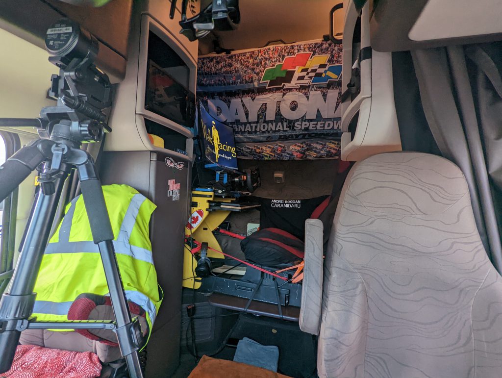 During all this time, sim racing remained his passion and in 2017 there was a leaderboard competition where he needed to invest more time, so his wife took charge of the truck while he was hotlapping from the passenger seat, which resulted in a top ten finish. He already told her on the first date: “Sim racing, I need this” – so she knew what she bought into. In 2018 the opportunity came to go to Canada on a work permit for trucking and they made the move. Being on the road for 5-7 days followed by two at home meant that he had to get creative. In the back of his truck he found the space to fit a pretty much full setup: a 32” screen, Fanatec CSL DD and pedals – all mounted on a wooden rig. Today he mainly plays iracing because there’s always a race going on, no matter the time of day. The only issue is the ping stability because he’s on a mobile connection – and forced cockpit camera – he’s a third person guy. However, “sim racing helps me stay sane” he says, sane enough at least to also run a team, raise two children and still manage to drive around 15 hours a day – 10 in the truck, 5 in the rig.